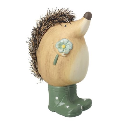 A sweet and happy hedgehog holding a pretty flower whilst stood in a pair of wellingtons.