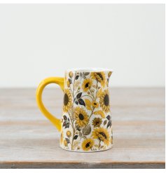 An assortment of 2 dolomite jugs with floral and stripe painted patterns in a rich butter yellow colour.